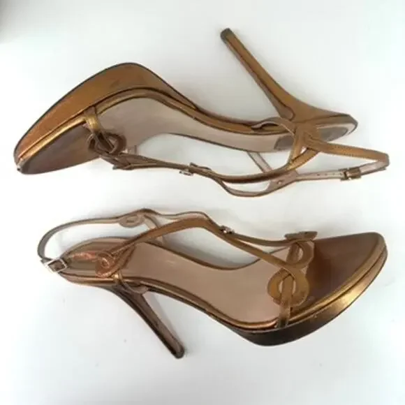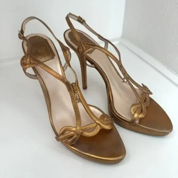 Dior Gold Metallic Strappy Sandals Size 39 Feminine Glam Elegant StatementDior Strappy Metallic SandalsColor: Gold metallicMaterial: Leather upper and solesWomen's size 39 (equivalent to US 8.5)Measurements: Heel height approximately 5 inchesAdditional Details: Luxurious Dior strappy sandals in shimmering gold metallic leather. Features an elegant t-strap design with a subtle "D" charm and adjustable ankle straps. Perfect for formal occasions, weddings, or a glamorous evening look.Condition: Good preowned condition with noticeable wear on the soles and minor scuffing on the heels and straps. See photos for full details.See all pics for any wear and condition.From Smoke and Pet Free Environment.Item shown is the exact item you will receive.Be sure to Follow us, We post several shoes/items often.SHIPS FROM DALLAS, TEXAS :)Feminine, Glam, Elegant, Minimalist, Statement, Classic, Date Night, Modern